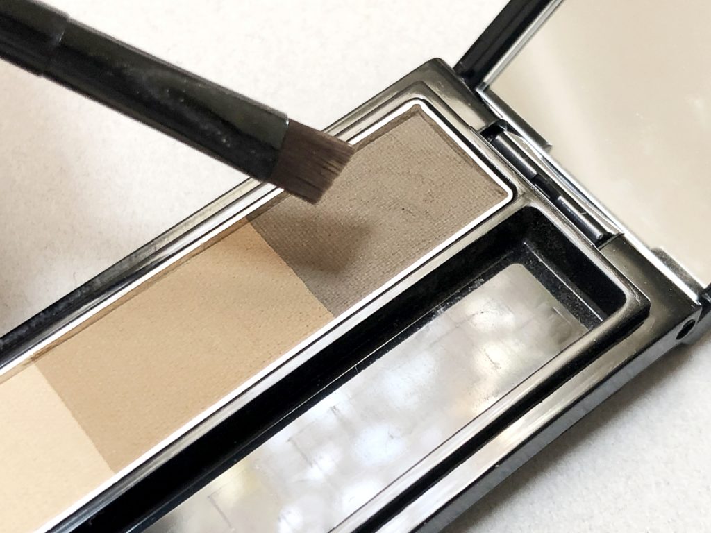 次にパウダーで眉全体描きましょう。まずは眉中央から眉尻に向かって形を取り、中を埋めていきます。眉頭は薄く、眉中央は濃いめ、眉尻は中央よりやや薄めに仕上げると立体感のある眉に仕上がります。多くのアイブロウパウダーは3色ほど入っていますのでそれらを使い分けましょう。ペンシルもパウダーもカラーは自分の髪色と同じ明るさ、黒髪の方はワントーン明るいブラウンを選ぶと自然です。