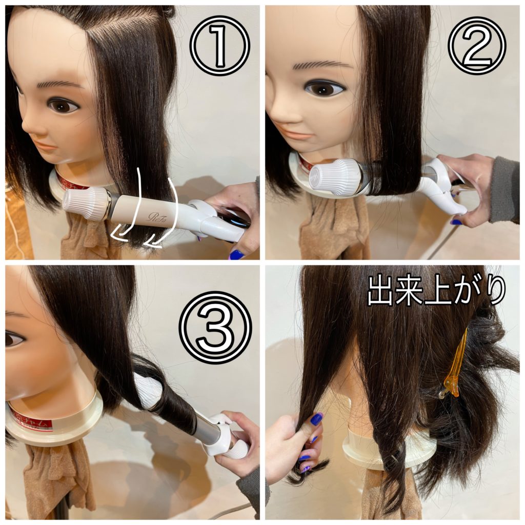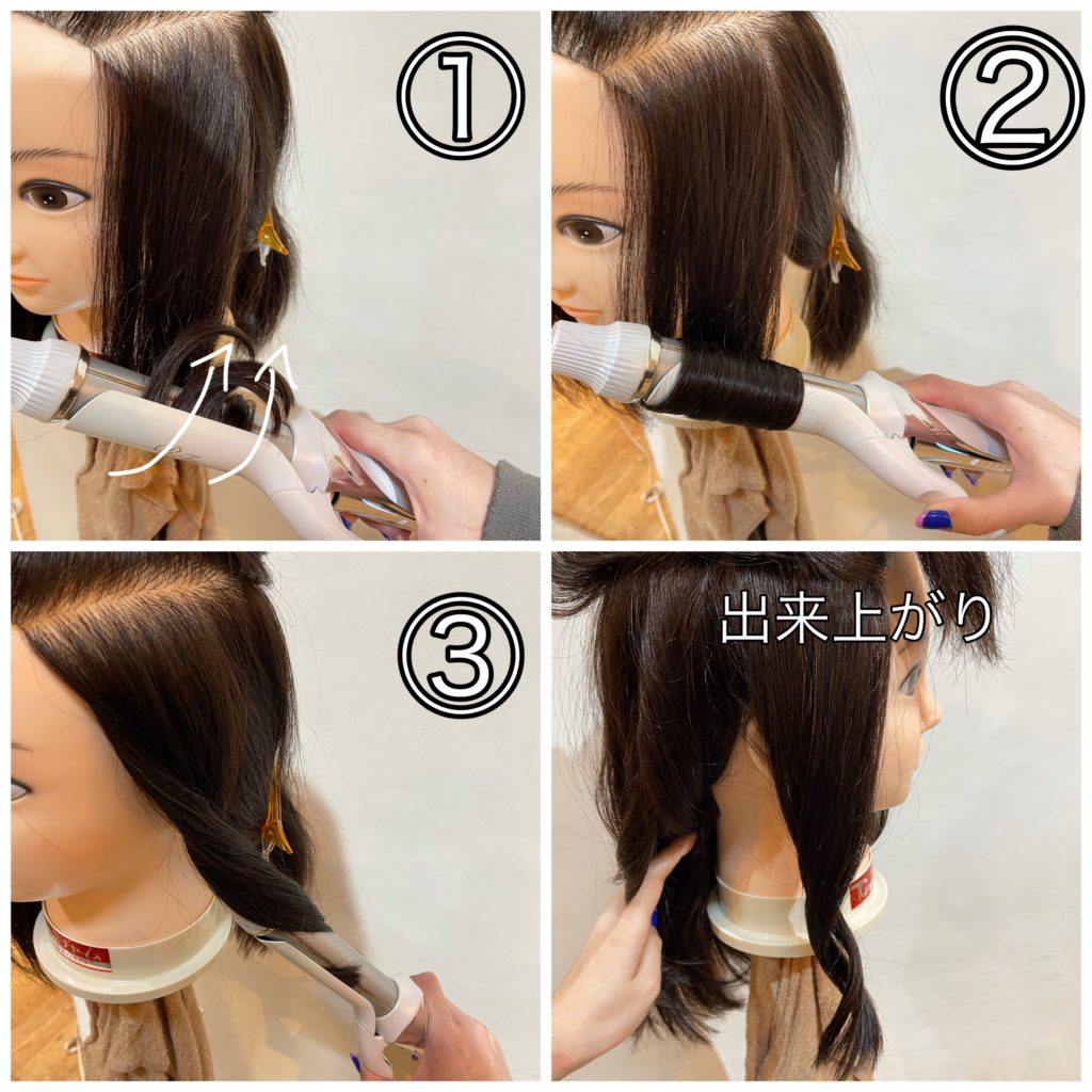 外巻きと内巻きを交互に巻いていくのが波巻きです。カールをしっかりとつけると今っぽくなります。ボブやミディアムの方は、2,3回でロングの方は5回を目安にすると自然な仕上がりになります!