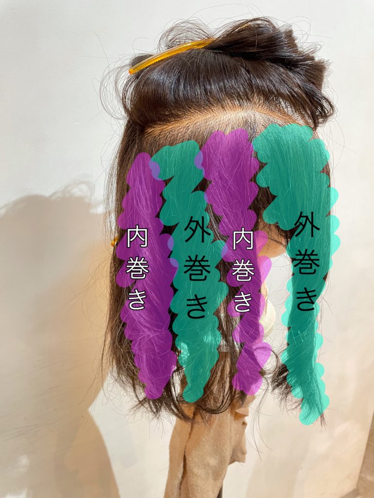 カールが内側になっている巻き方です。フォワード巻きともいいます。仕上がりがかわいい系になります。
