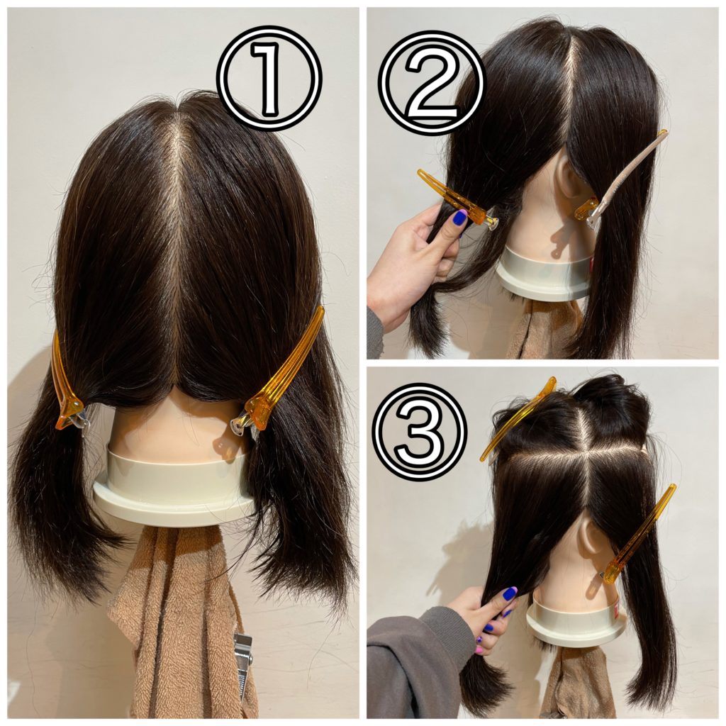 3.こめかみあたりの高さで髪の毛を上下に分けていきます。