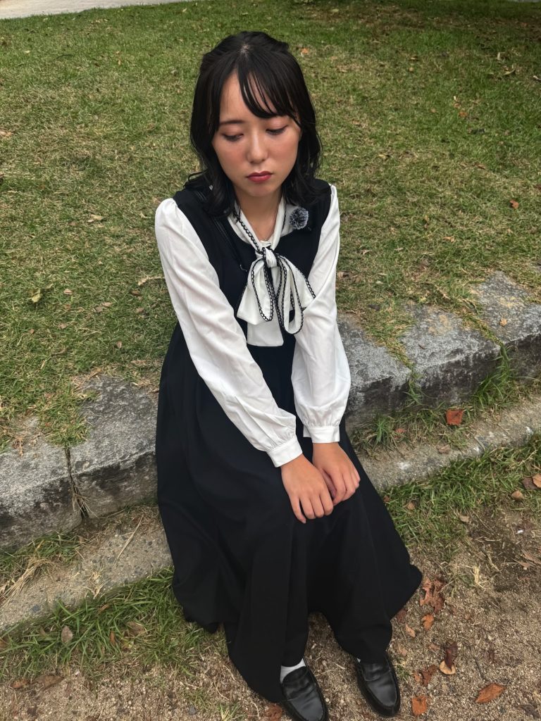 白いブラウスに黒のワンピース、大きなリボンがポイント◎ 靴はローファーで可愛い雰囲気にしました。