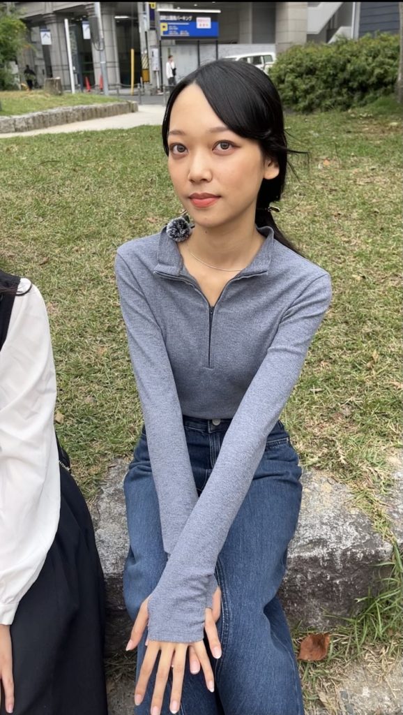 今っぽい韓国系。デニムスカートの色味に合わせたグレーのトップスで少しクール系のトーンでいきました。ネックレスもトーンに合わせてシルバーでいきました。