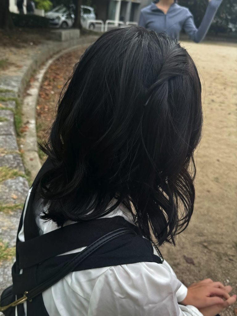 後ろから見てゴールド系ともあっていたので、韓国系のお姉さんっぽくまとめました。毛先は軽くゆる巻きで、顔周りは今っぽい後れ毛感のある感じで巻きました。